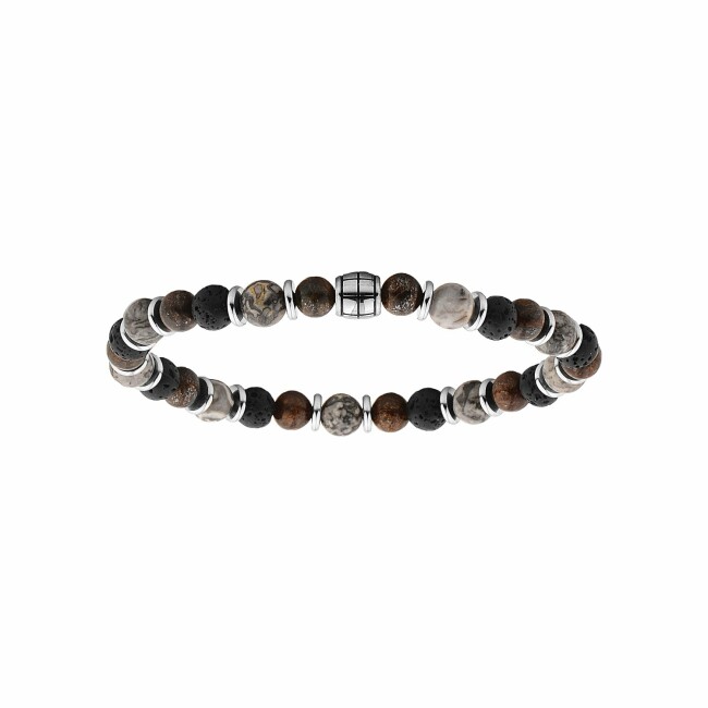 Bracelet acier extensible boules jaspe gris, pierre de lave, bronze gris véritable diam 60mm