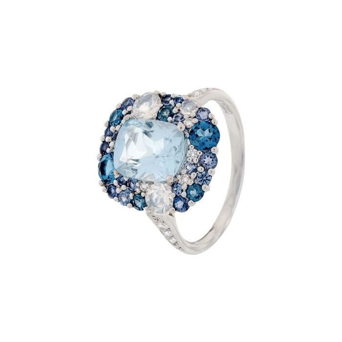 Bague Isabelle Langlois en or blanc, aigues-marines, topazes, pierre de lune, iolites et saphirs Description détaillée
