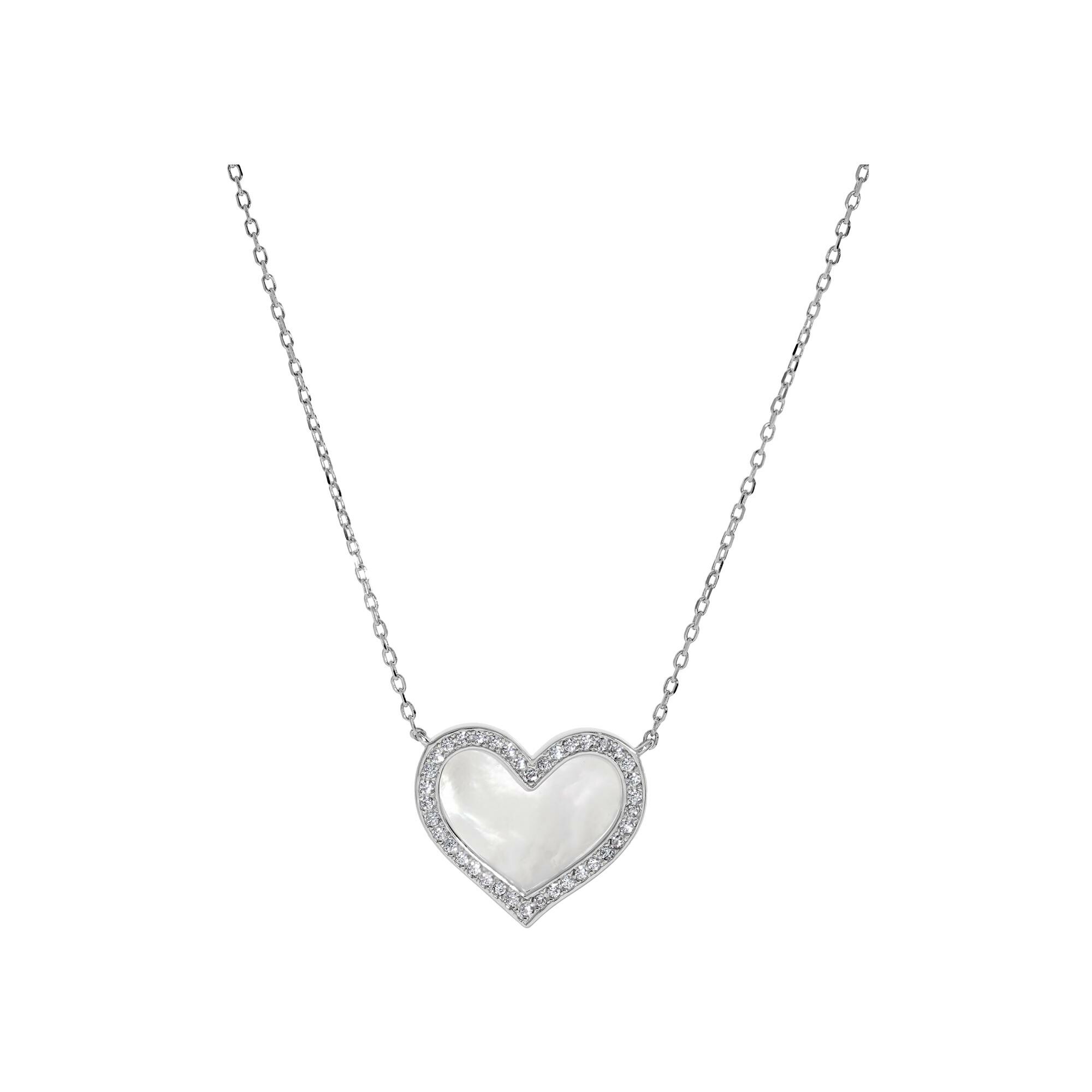 Collier en argent rhodié massif pendentif coeur nacre véritable contour oxydes blancs 39,5+4,5cm Description détaillée